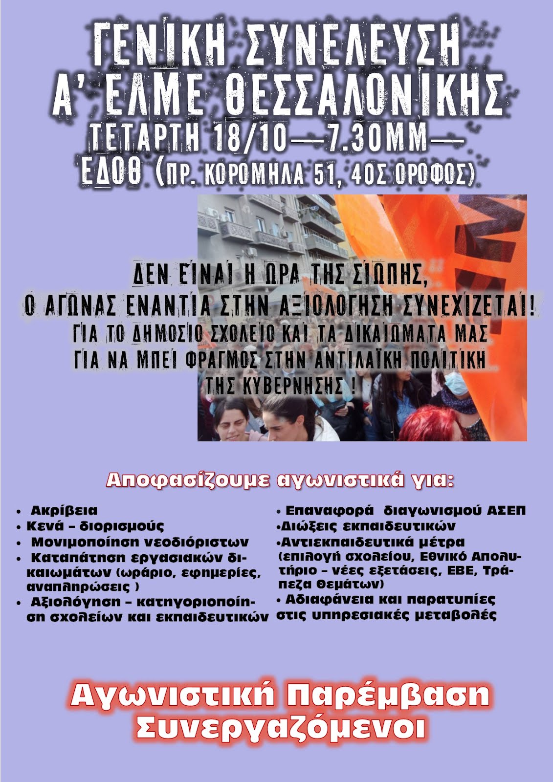 Καλούμε τους συναδέλφους μαζικά να συμμετέχουν στις ΓΣ των ΕΛΜΕ και να καταψηφίσουν τα ενιαία κείμενα που κατέθεσε η ΟΛΜΕ. Να μην αποδεχθούμε την αντιδημοκρατική και πραξικοπηματική στάση της ηγεσίας της ΟΛΜΕ που στις πιο κρίσιμες στιγμές του κλάδου ακολουθεί παρόμοιες πρακτικές (στις ηλεκτρονικές εκλογές για ΠΥΣΔΕ ακύρωσε τη ΓΣ των προέδρων για να μη καταψηφιστεί η απόφασή της συμμετοχής σε αυτές, στην κρίσιμη ΓΣ στις 16/10/2021 σταμάτησαν την απεργία αποχή του κλάδου με ψήφους προέδρων, που άλλαξαν την απόφαση των ΓΣ των ΕΛΜΕ τους και δεν ψήφισαν τη συνέχιση της απεργίας αποχής, κ.ά.).
