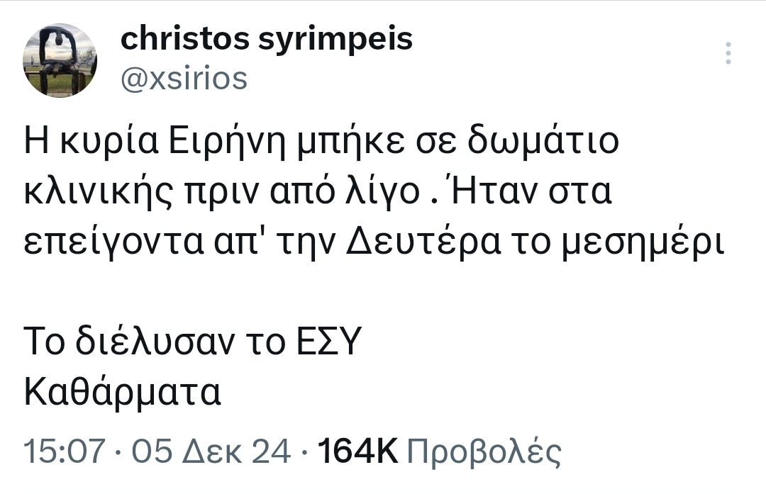 Την περασμένη Πέμπτη 5/12 ο Χρήστος Συρίμπεης - γιος του αείμνηστου Καρδιολόγου Σπύρου Συρίμπεη πασίγνωστου στην Πάτρα - εξέφρασε παράπονο στα μέσα κοινωνικής δικτύωσης (όπου γράφει επώνυμα) επειδή η μητέρα του Ειρήνη Συρίμπεη παρέμεινε στο ΤΕΠ του Π.Ν. Πάτρας (Ρίου) επί 3 (τρία) ολόκληρα εικοσιτετράωρα μετά την επείγουσα εισαγωγή της στην Παθολογική κλινική διότι δεν υπήρχε διαθέσιμη κλίνη νοσηλείας. Στην ολιγόλογη καταγγελία δεν αναφερόταν ονομαστικά ο κ. Γεωργιάδης ούτε ο κύριος Μητσοτάκης. Αυτολεξί γράφτηκε το ακόλουθο : "Η κυρία Ειρήνη μπήκε σε δωμάτιο κλινικής πριν από λίγο. Ήταν στα επείγοντα από την Δευτέρα το μεσημέρι. Το διέλυσαν το ΕΣΥ. Καθάρματα".